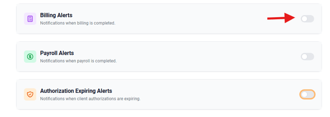 The Alerts and Notifications feature allows you to configure automated alerts for billing, payroll, and expiring authorizations. When enabled, eCaring will automatically send notifications to office staff when specific events occur, helping you stay on top of important notifications.