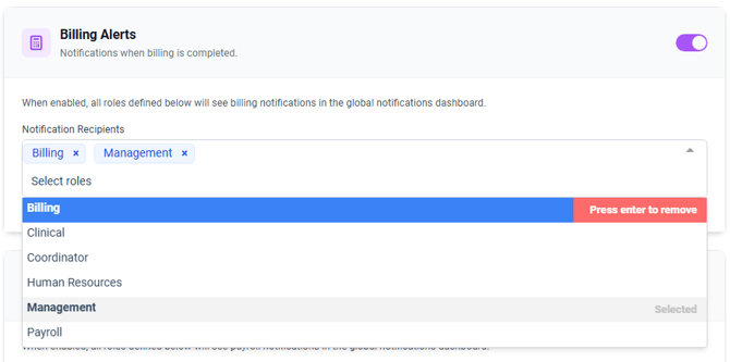 Once the alert is enabled, select the roles in which you would like to receive notifications in the global notifications dashboard.