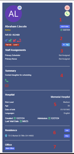 - 5: Client’s preferred hospital is displayed here when chosen under Edit Profile. Risk level and other basic demographic information is displayed here, when the client profile was created, their last visit date, and their admission date.