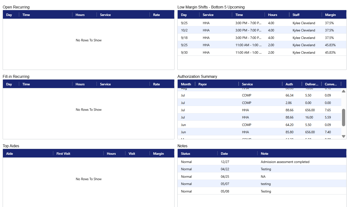 This grid allows you to quickly see if this client has any open shifts schedules, upcoming low margin shifts, any fill-ins for recurring shifts, Authorization Summary, as well as Top Aides selected for the client and most recent Notes entered.
