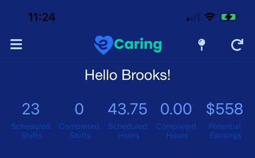 The top section of the screen displays your greeting, "Hello!" and a summary of your scheduled shifts for the week. *Potential Earnings is strictly an estimate. This does not take into account taxes, healthcare, etc.*