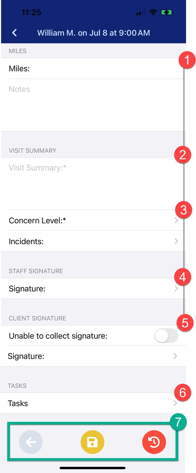 - Red Submit Button: Submit your note and Clock Out. The note must be submitted to clock out of the visit.
