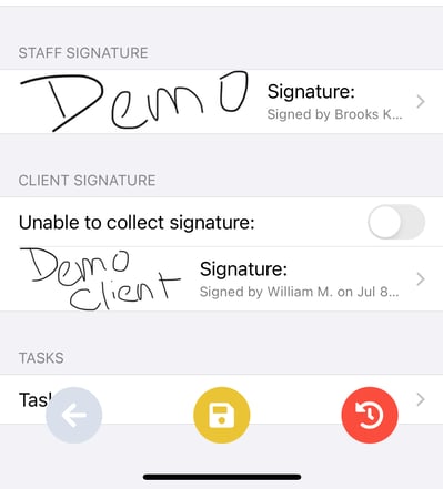 - Client Signature (required): If you are unable to collect a client signature, toggle the button to green to indicate it as such. If you are collecting a client signature, complete the same steps as Staff signature.