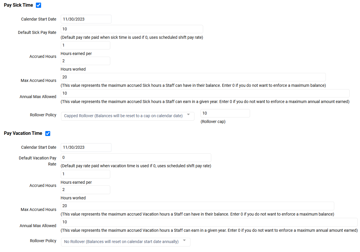 - Sick and Vacation accrual hours will start to accrue once the Pay Sick Time or Pay Vacation Time setting is enabled
