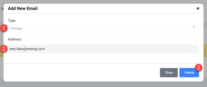 • Select the Type of email (primary or alternative). The primary email will display on the client’s homepage.