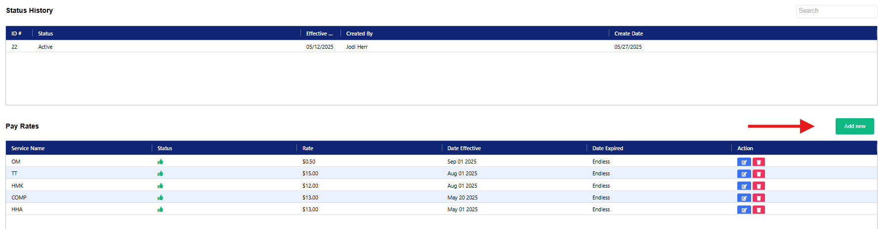The last step before scheduling the new staff member is to add payrates, if rates are not in for each authorized service, the staff cannot be scheduled to visits.