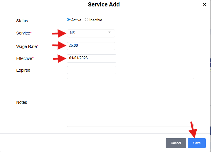 Effective: Enter rate effective Note: This date will effect scheduling, for example if that effective date is 1/1 a schedule can be entered until 1/2.
