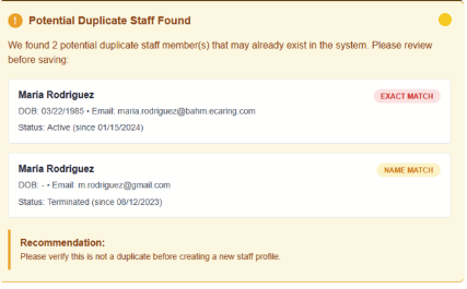 Note: If you enter a profile that has the exact patch for First Name, Last Name, Date of Birth and/or email you will receive the following alert: