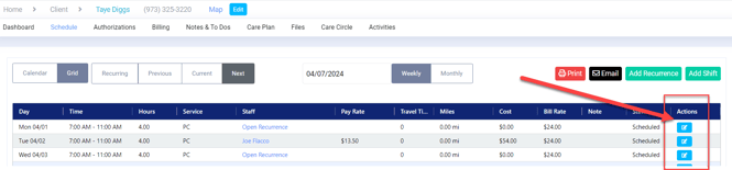 You can also cancel a visit anywhere the Edit Shift Icon is displayed (grid caledar view and Verification dashboard). This opens the Edit Shift window.