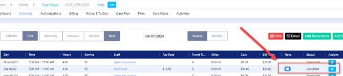 The shift will now display the status Cancelled. The Note icon will display the Note that was entered for the Cancel Reason.