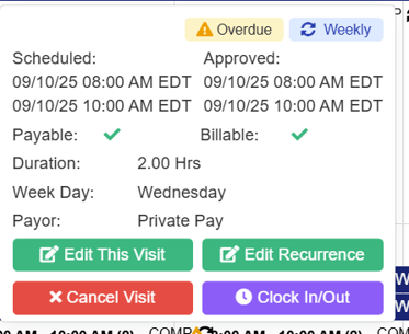 Hover over the visit, the Quick Action options will populate