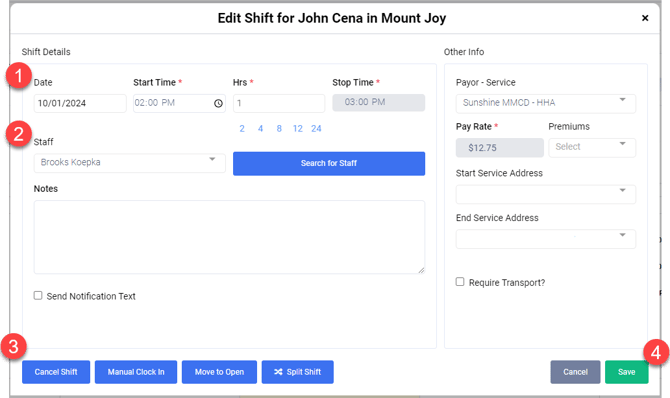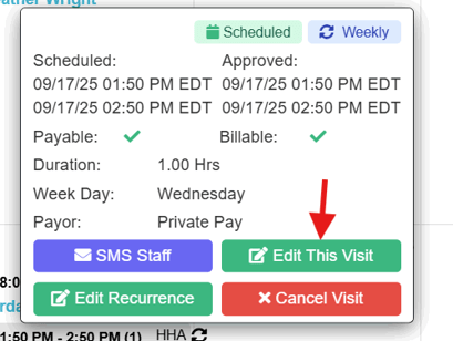 Hover your mouse over the shift you would like to edit. Select Edit This Visit in the Quick Action box will populate