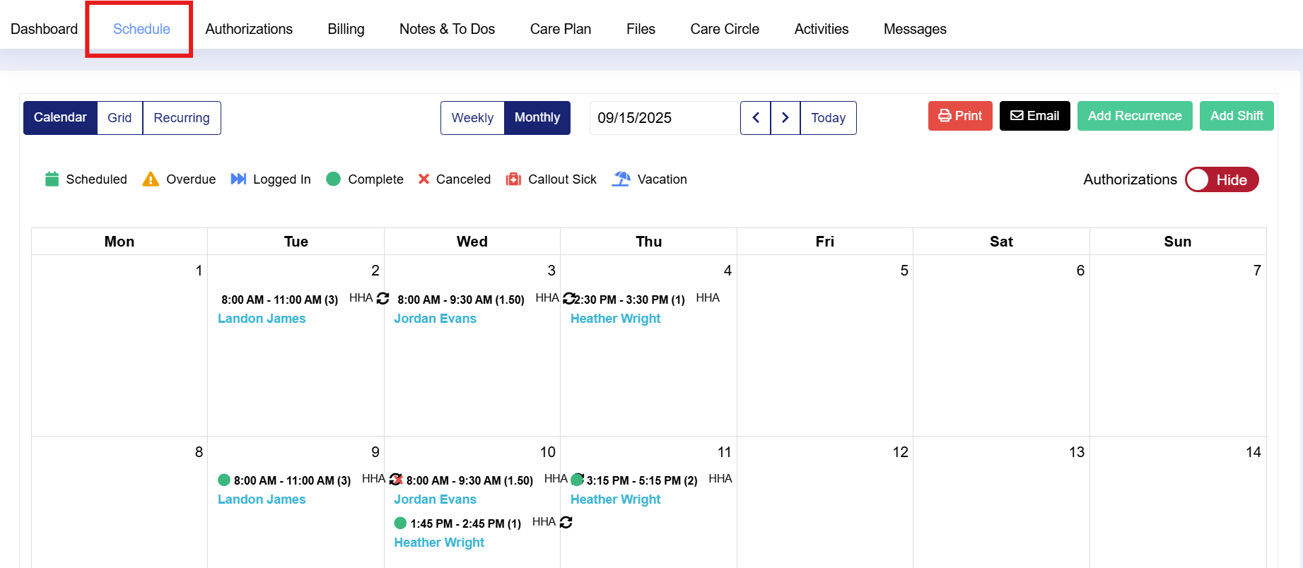 Navigate to your client's Schedule by navigating to their profile and selecting Schedule, this same process can be completed the Shift Monitor Dashboard as well.