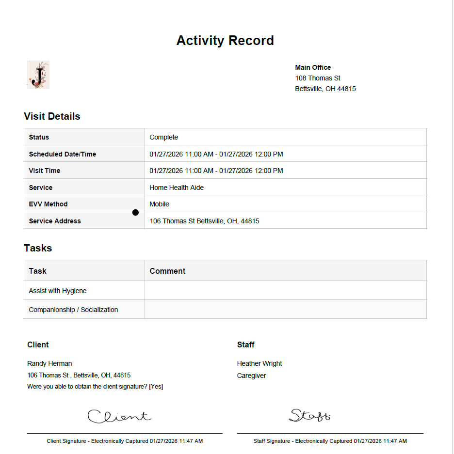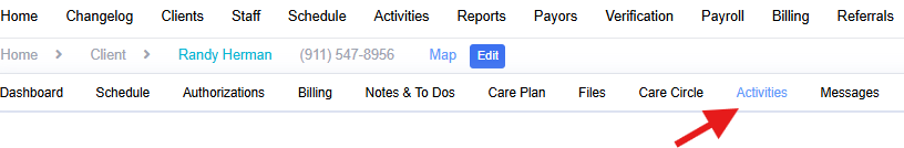To access, create a PDF, or print an activity record, also known as a visit note, can easily do so from the client or staff profile. To access the activity record complete the following steps: