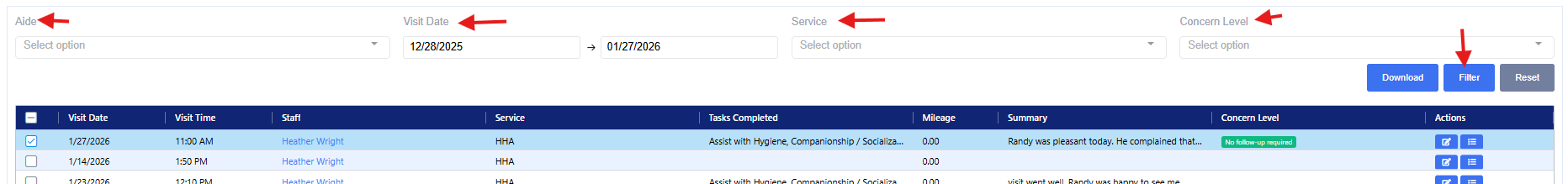 Concern Level: This is entered by the staff during the visit and can be used to filter visits