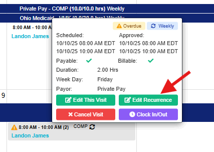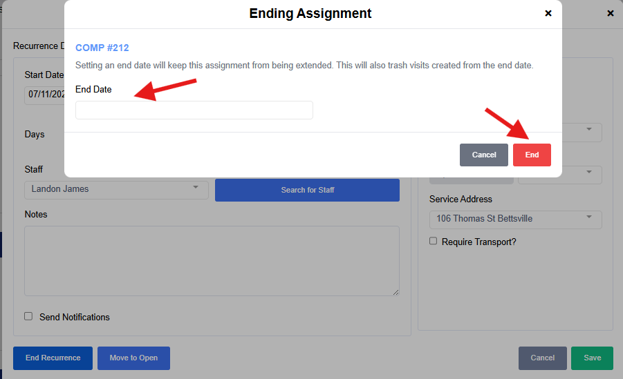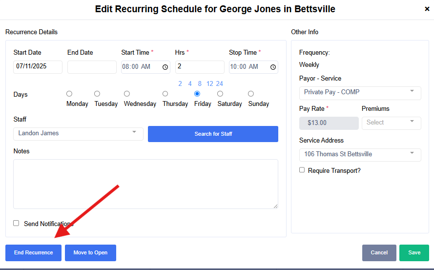 Note: you will receive an error if you are attempting to end a recurrence in the past with visits are already completed. Be sure to verify the last date of service on that recurring shift prior to selecting a date.