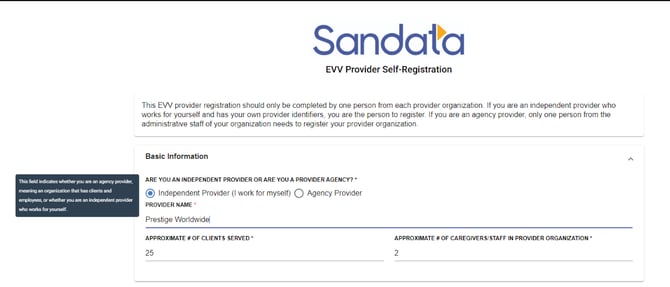 Enter your provider information in the fields of the Basic Information section. Use the radial button to select if you are an Independent or Agency provider. **You can hover your mouse over each question to view additional information to help you better answer.