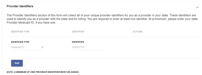 - Optional: Use the Add button in the Provider Identifiers section to add any additional identifiers that identify you as a provider. You must have at least one identifier as a minimum.