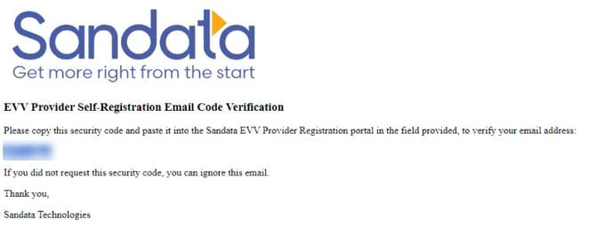 An e-mail will be sent to that address from DoNotReply@Sandata.com containing a verification code.