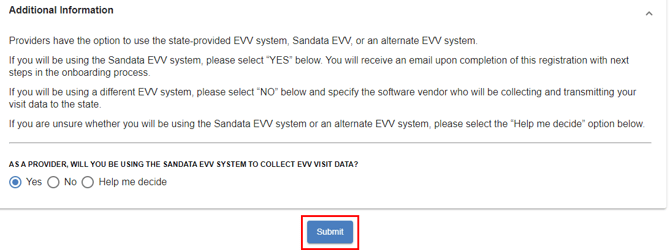 - Use the radial button in the Additional Information section to confirm if you are using Sandata EVV to electronically collect visit data. Select the option, “Help Me Decide,” if you need assistance deciding which option to choose.