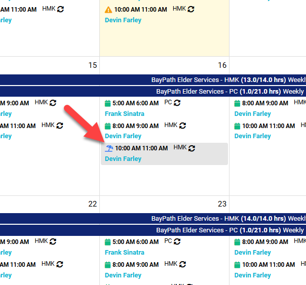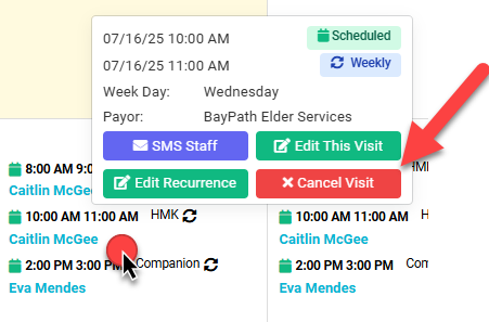 Hover your cursor over the shift the staff member would like to use time off for and select Cancel Visit.