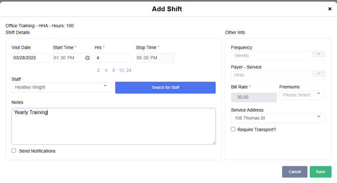 - The Service will also need to be added to the Private Pay Payor and Staff Payroll rates to allow scheduling for tracking.