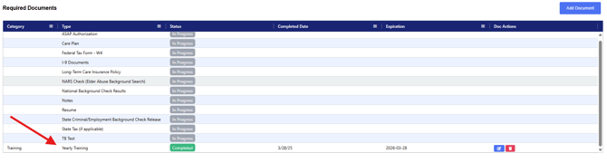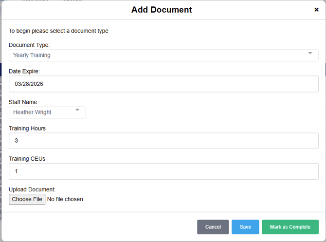 - Select the Training Doc and complete the needed information and Save or Mark as Complete