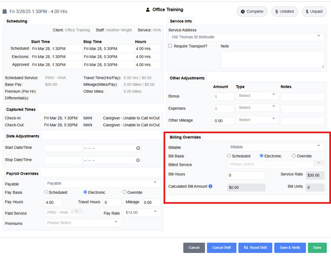 - Verify the information to ensure accuracy, verify to override any billing hours if needed, select Save and Verify