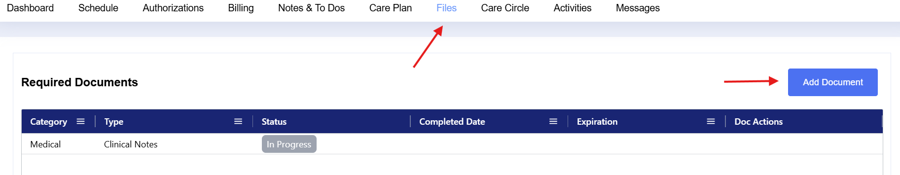 - Once your forms are completed, you can upload the file to the Client Profile by selecting Files and Add Document