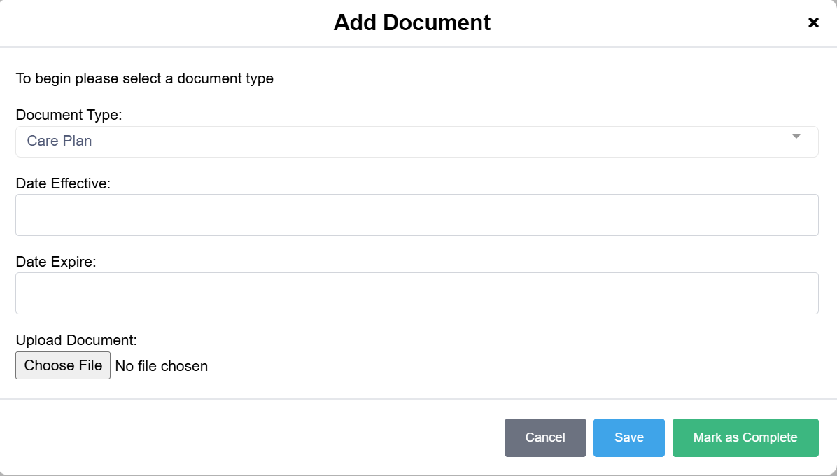 - Select the Document Type from the drop down and complete any available fields. Select Save or Mark as Complete