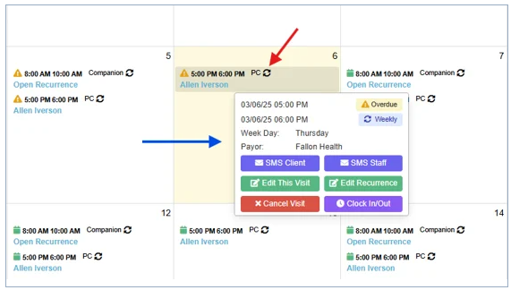 We've introduced a new "Quick Action" pop-up. When you hover over a visit, you'll see a new pop-up menu with quick actions you can take. From here, you can directly send the client or caregiver a text message (as long as they have a "mobile" number), edit the visit or recurrence, Cancel the visit, or perform a Manual Clock-in/out.