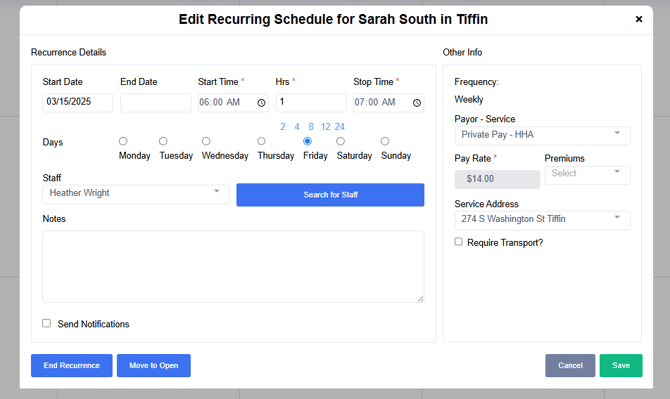 - Note: When you edit a recurrence, it will not default to the original start date. If you are editing from a calendar or specific visit, it will use that date as the new start date. if you are editing on the "Recurrence" page, you'll need to manually choose a start date for your edits to be effective.
