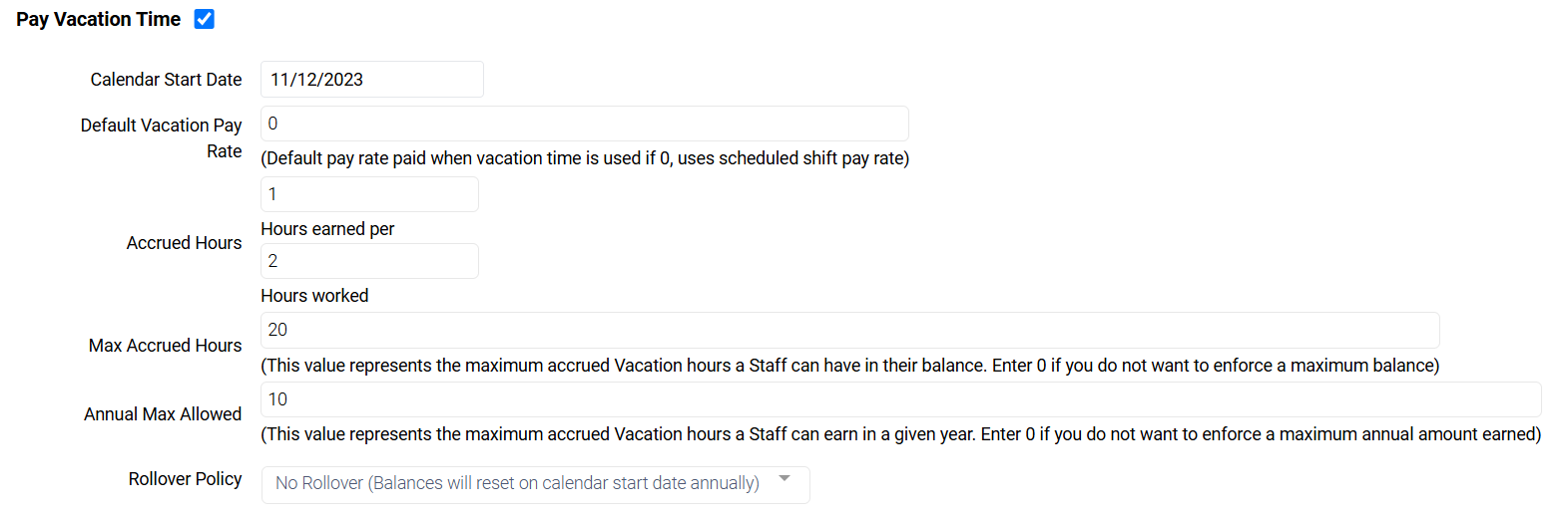 Rollover Policy: Set the number of hours that staff can rollover at the start of the new calendar year, determined by the calendar start date.