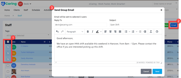 - Check off the employees you'd like to send an email to, then click Email located on the far right hand side. Clicking email will open up the Send Group Email window.