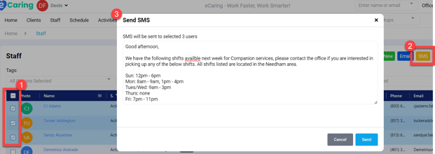 - Check off the employees you'd like to send a SMS to, then click SMS located on the far right hand side. Clicking SMS will open up the Send SMS window.